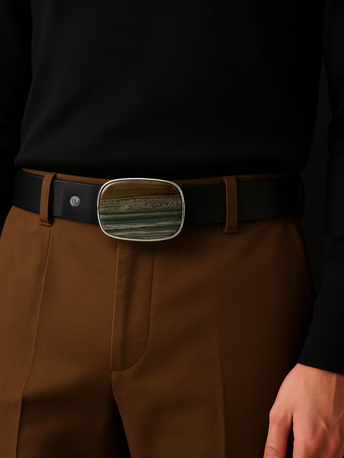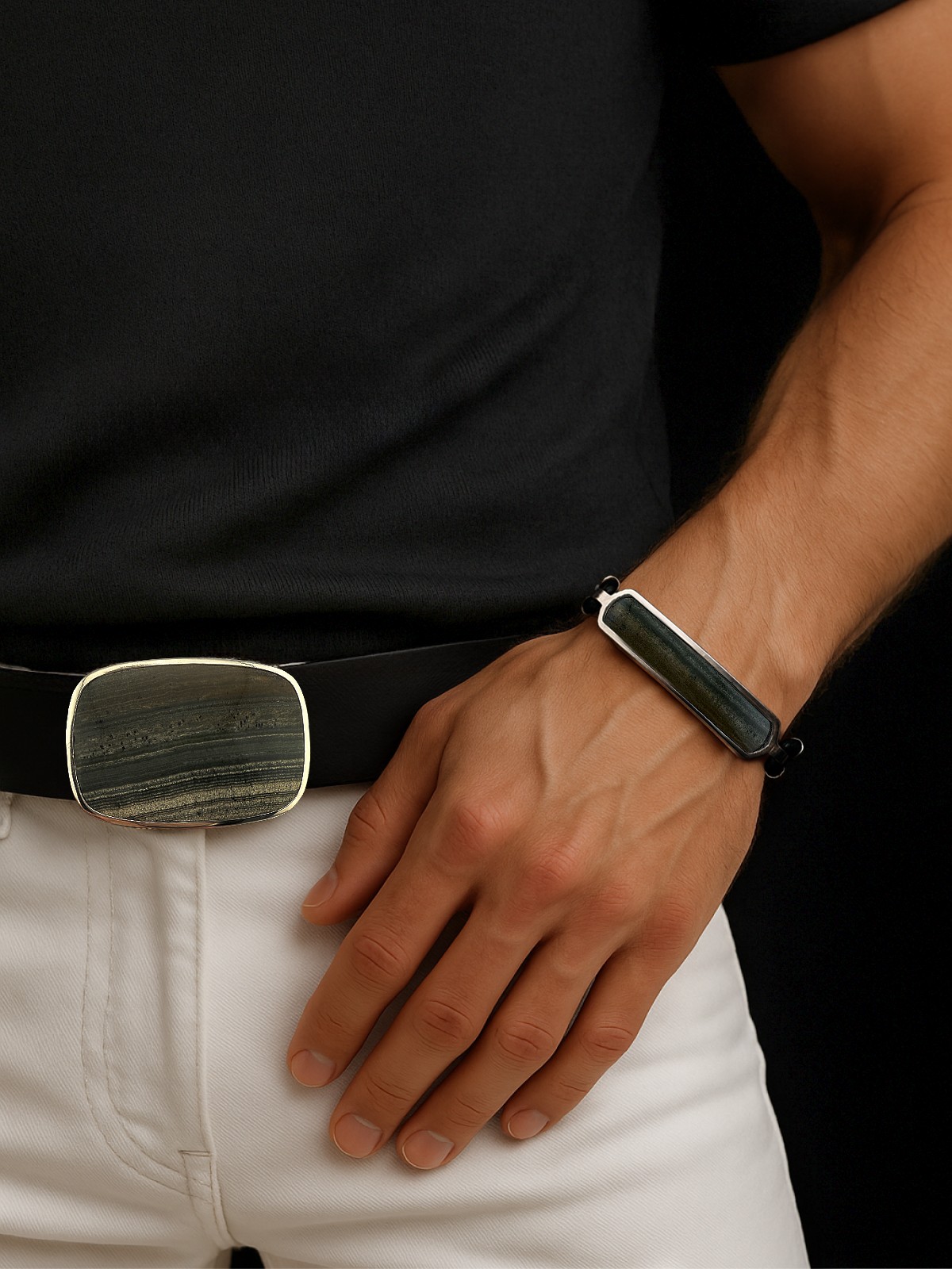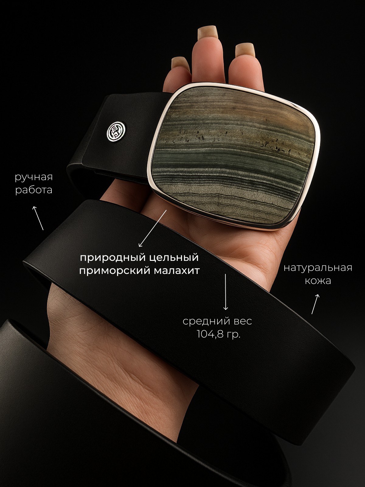 Пряжка 1743М выполнена из серебра 925 пробы и украшена натуральными вставками: 1 Приморский малахит 50 мм на 66,5 мм, вес 62.77 карат