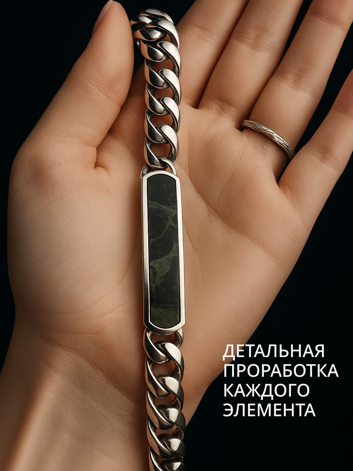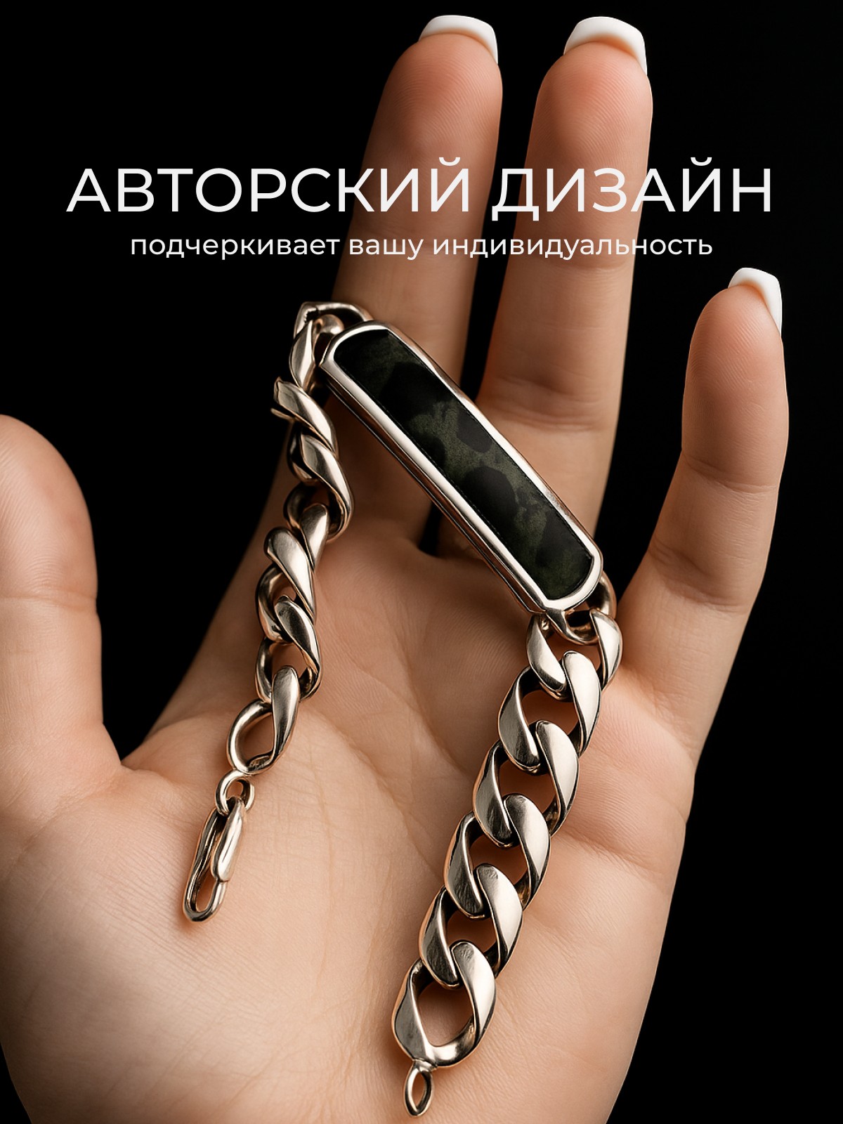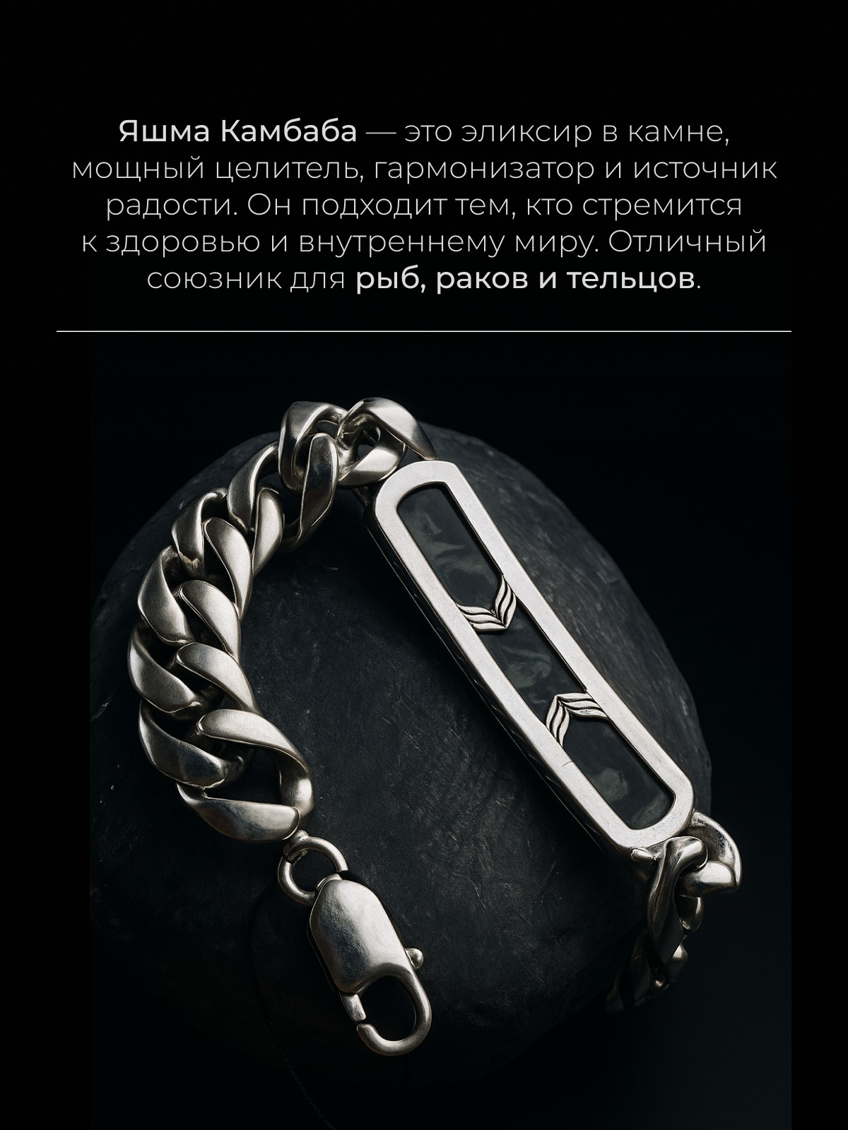 Браслет 1747Як выполнен из серебра 925 пробы и украшен натуральными вставками: 1 Яшма океаническая Камбаба пластина 8,5 мм на 43,5 мм, вес 3,2 карат