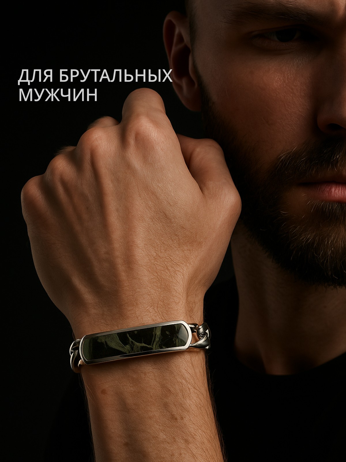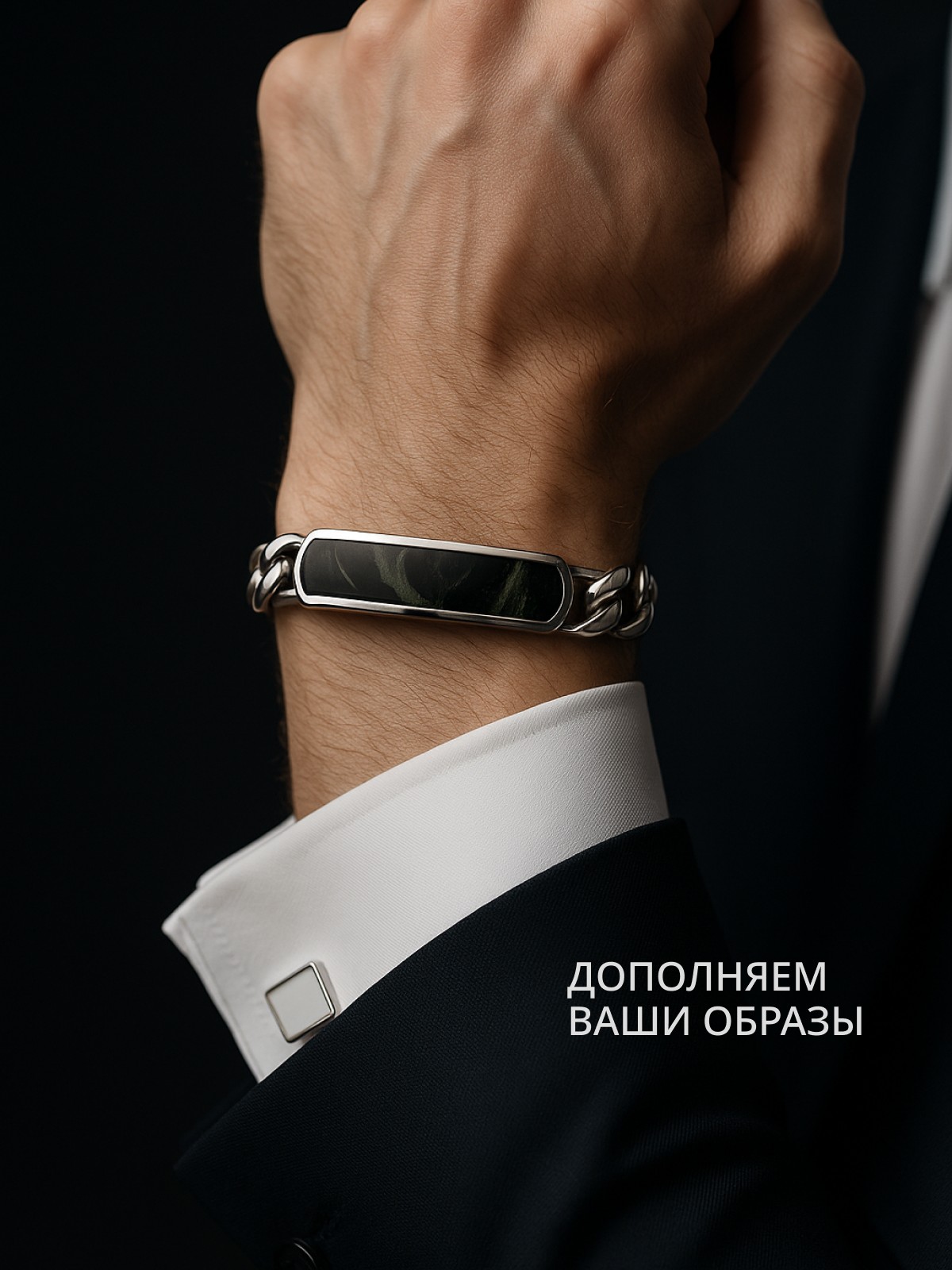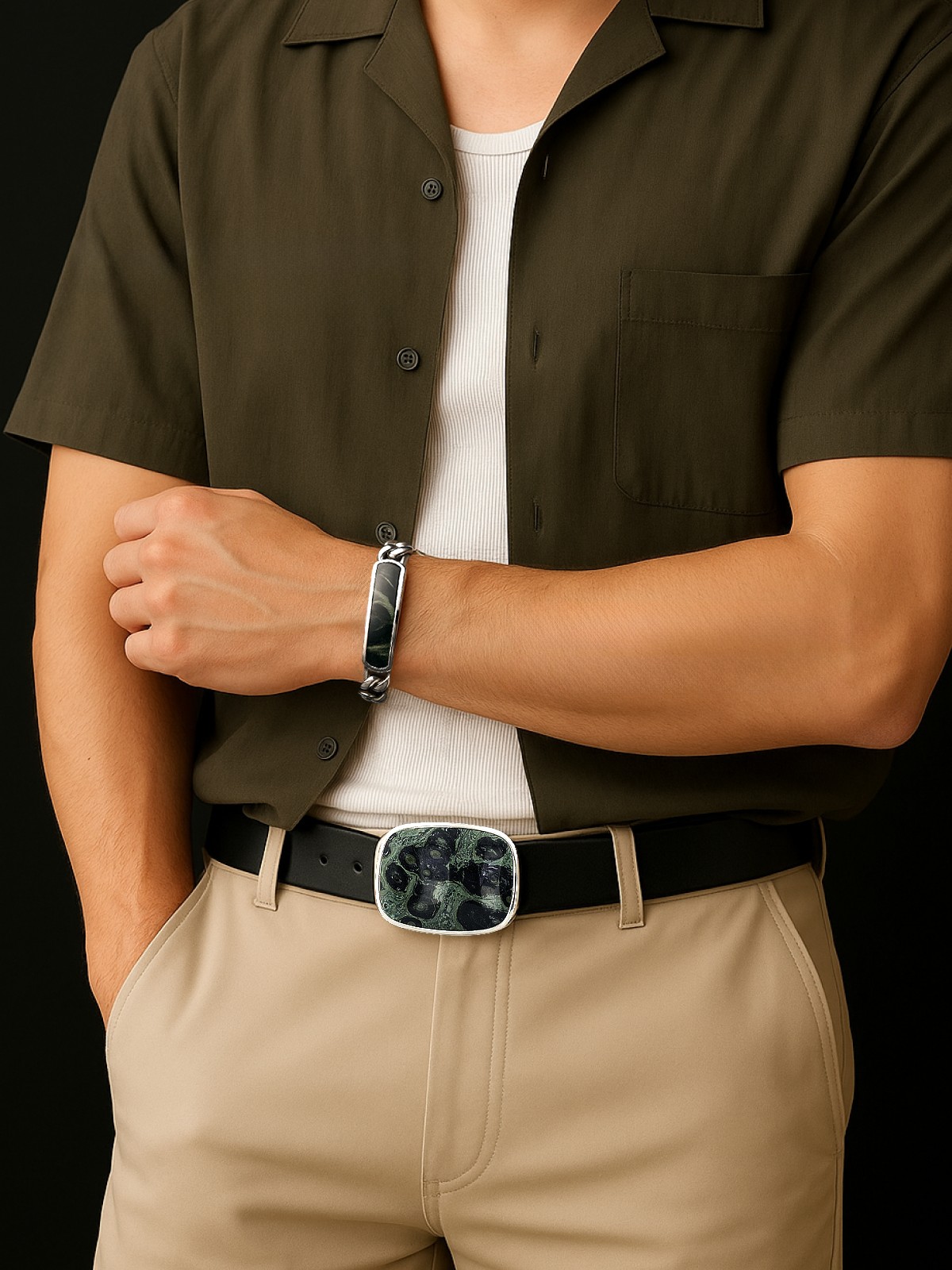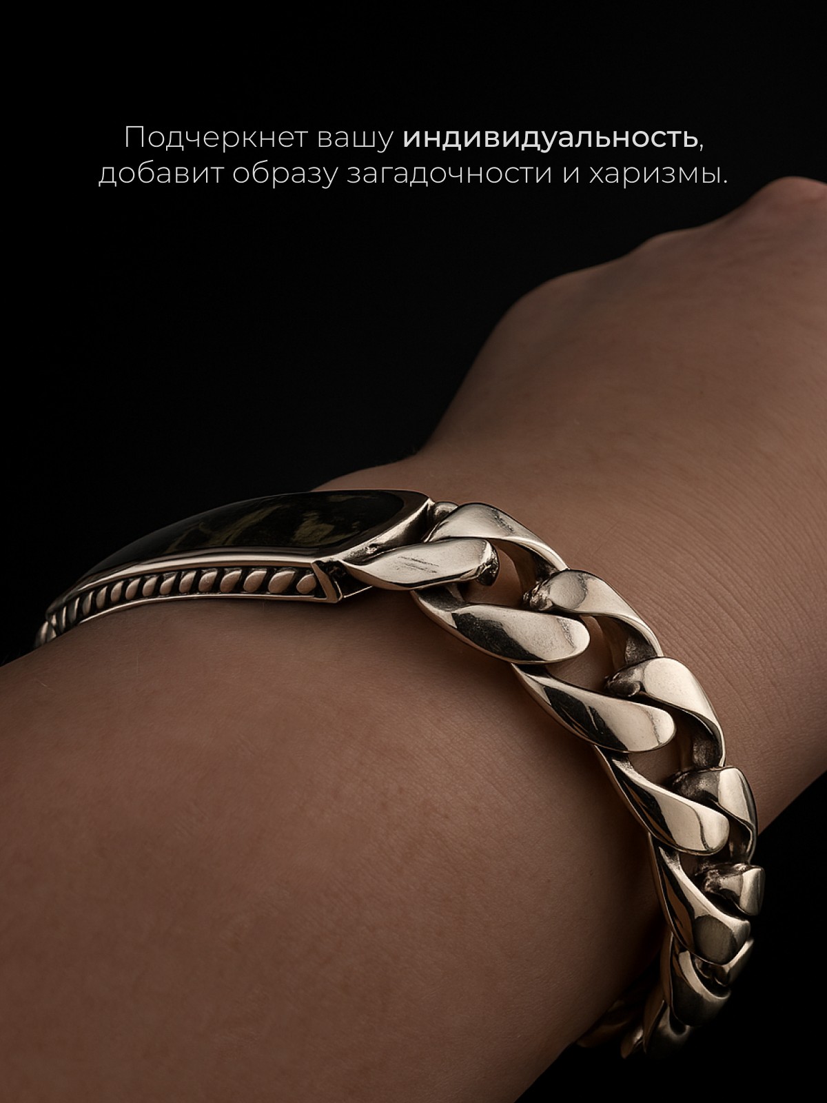 Браслет 1747Як выполнен из серебра 925 пробы и украшен натуральными вставками: 1 Яшма океаническая Камбаба пластина 8,5 мм на 43,5 мм, вес 3,2 карат