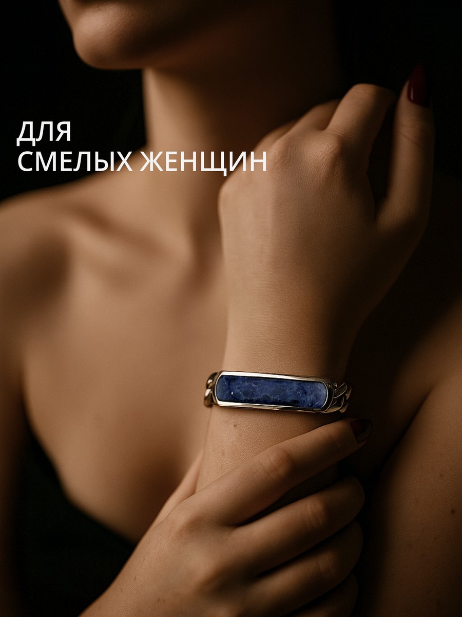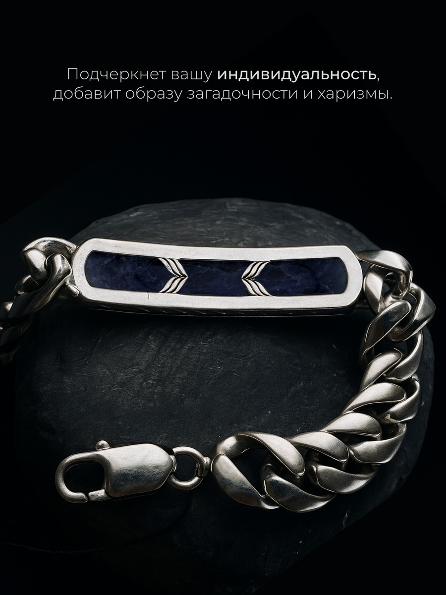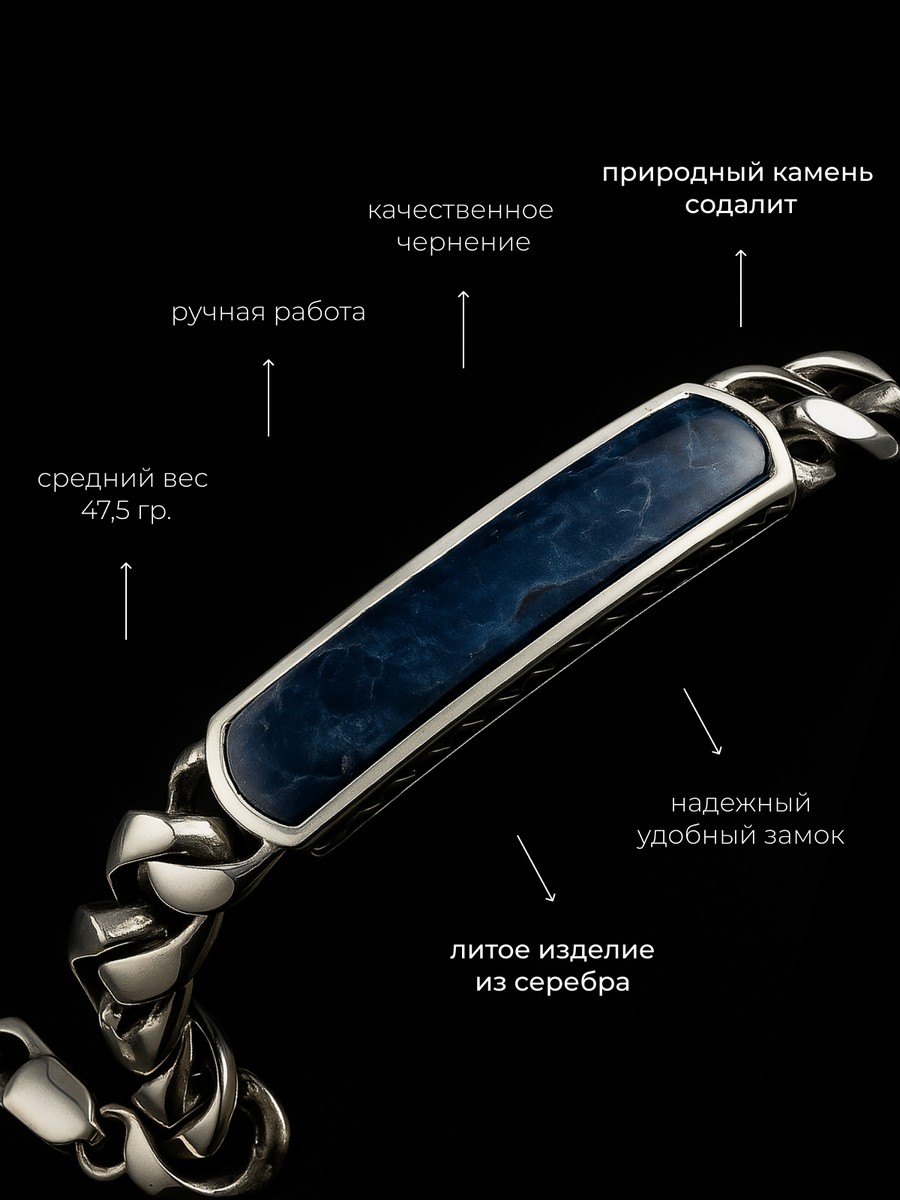 Браслет 1747Со выполнен из серебра 925 пробы и украшен натуральными вставками: 1 Содалит пластина 8,5 мм на 43,5 мм, вес 2,9 карат