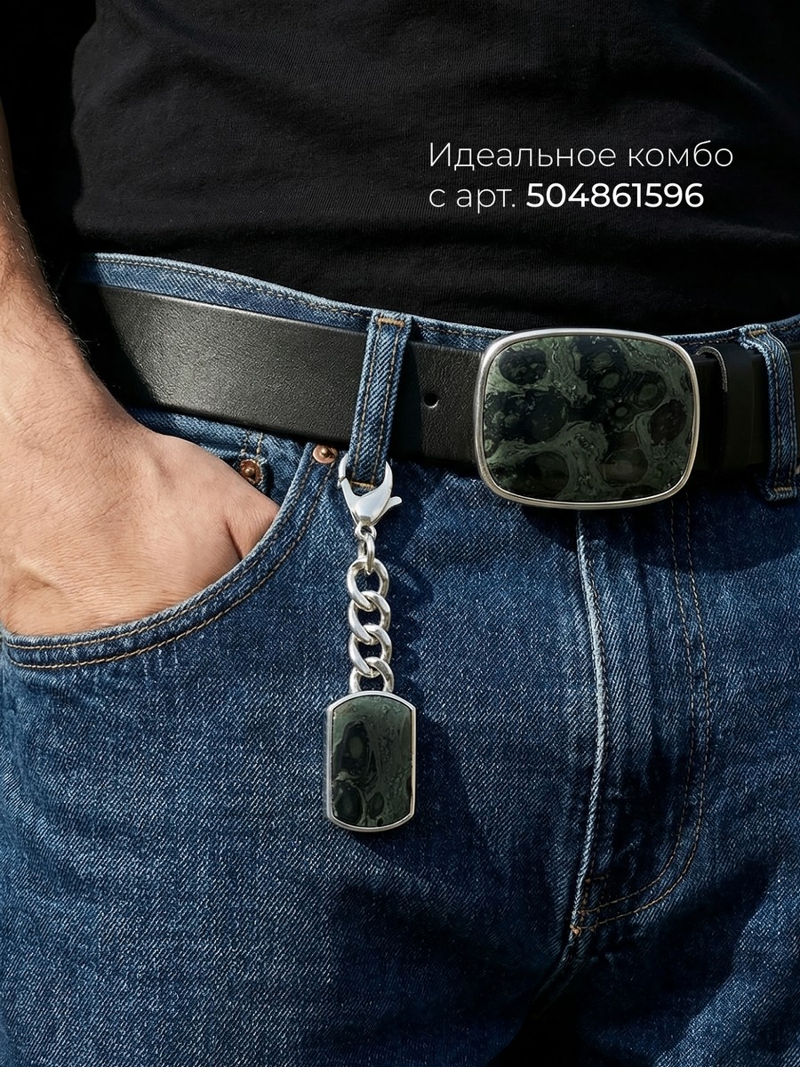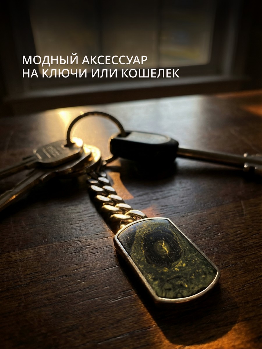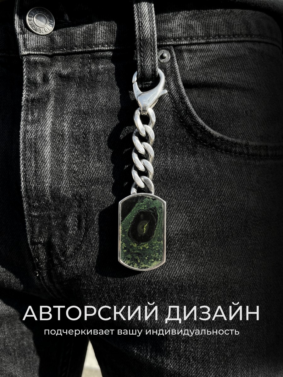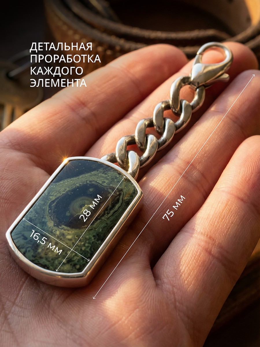 Брелок 1747Як выполнен из серебра 925 пробы и украшен натуральными вставками: 1 Яшма океаническая Камбаба пластина 16,5 мм на 28 мм, вес 3,97 карат