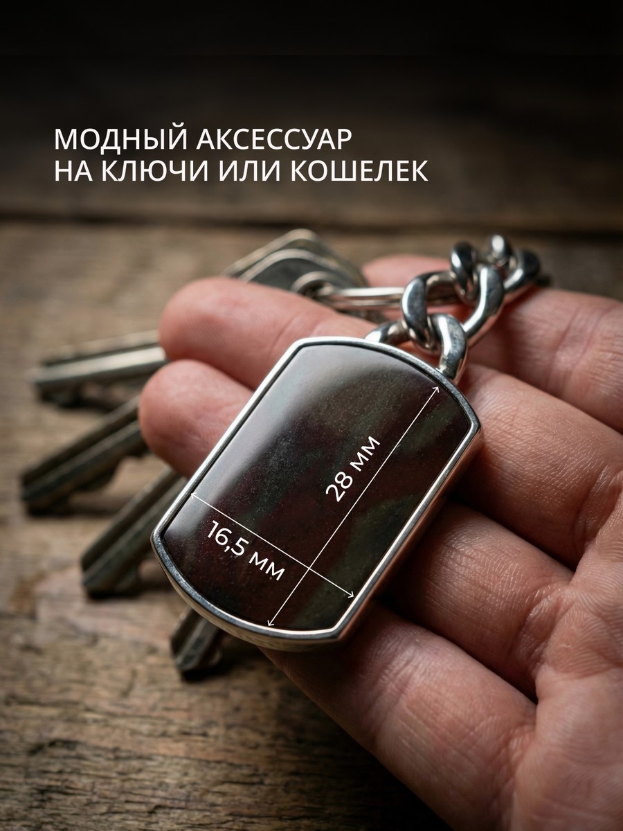 Брелок 1747Я выполнен из серебра 925 пробы и украшен натуральными вставками: 1 Яшма 16,5 мм на 28 мм, вес 3,55 карат