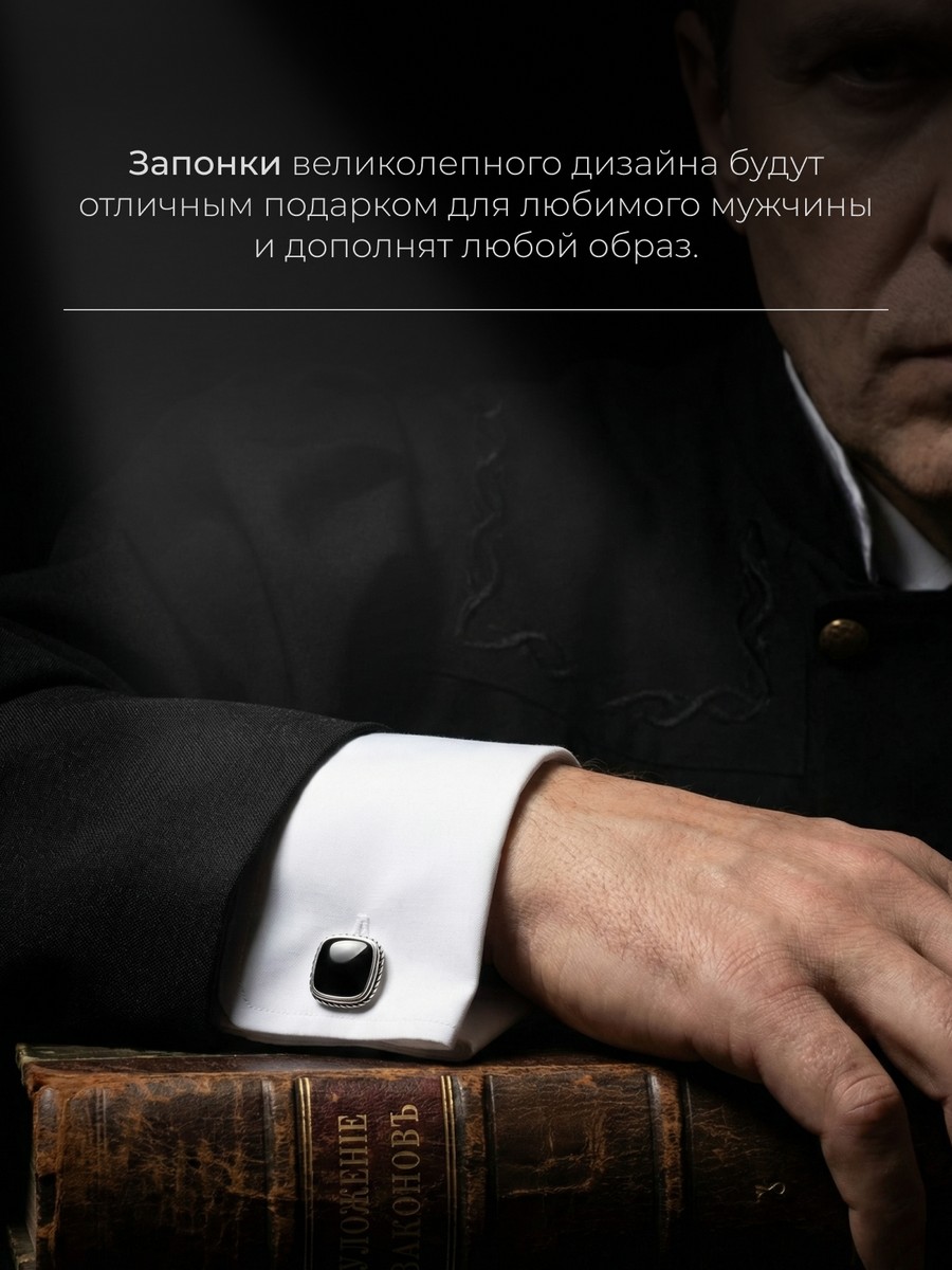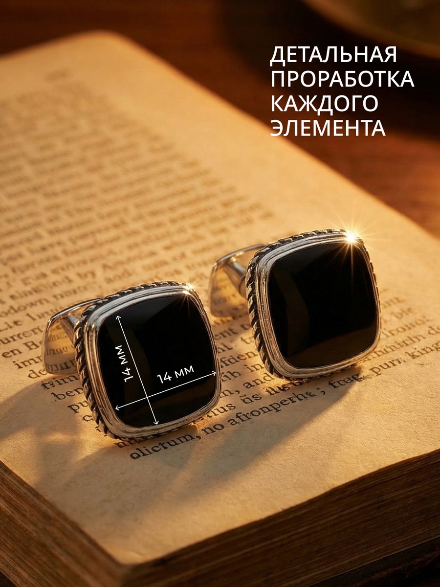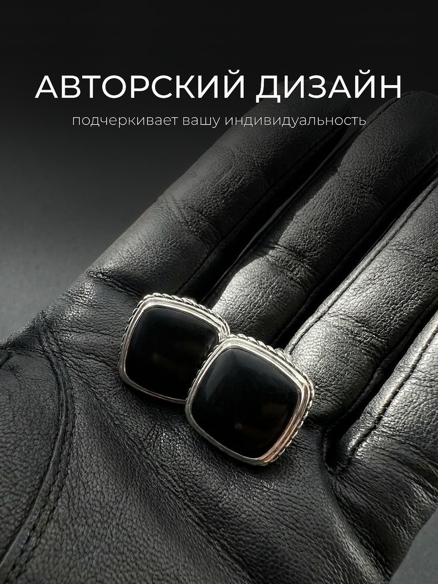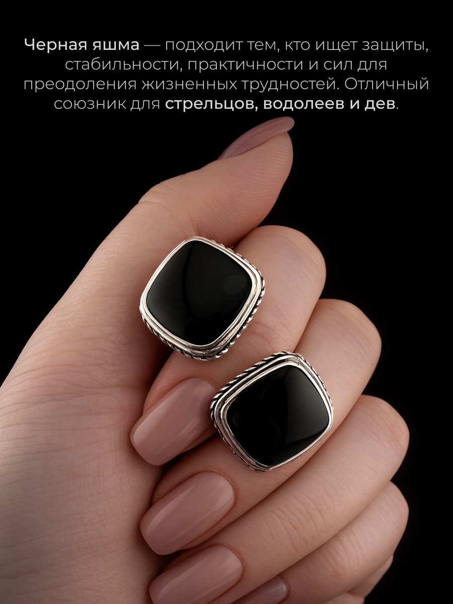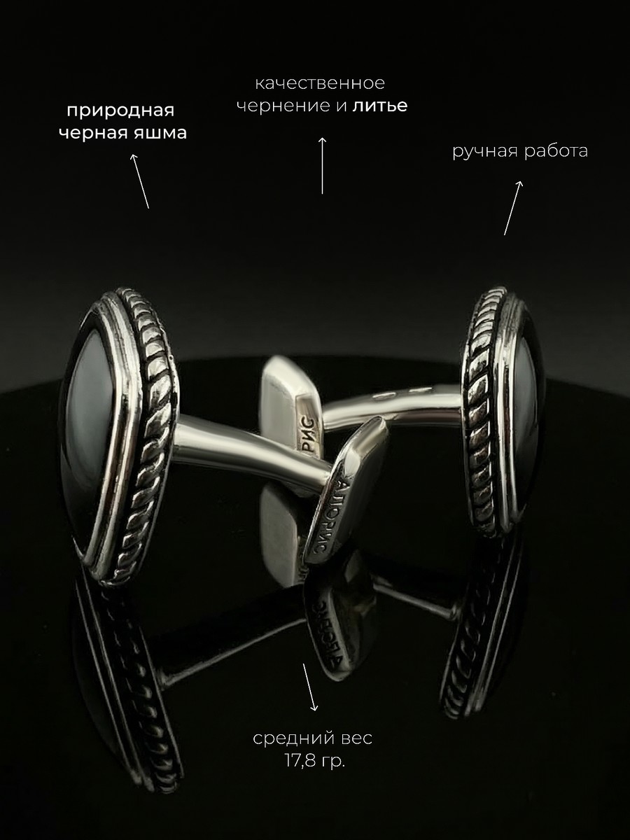 Запонки 1747Яч выполнены из серебра 925 пробы и украшены натуральными вставками: 2 Яшма черная 14 мм на 14 мм, вес 3.09 карат