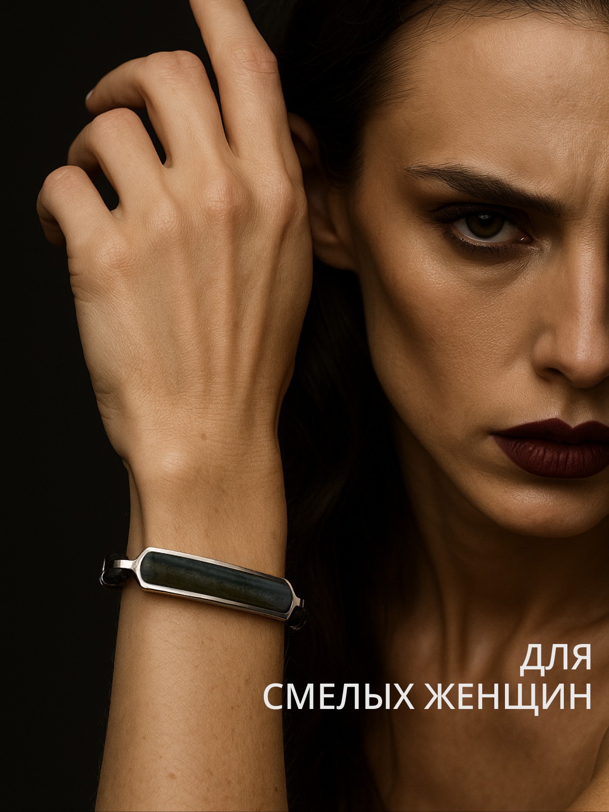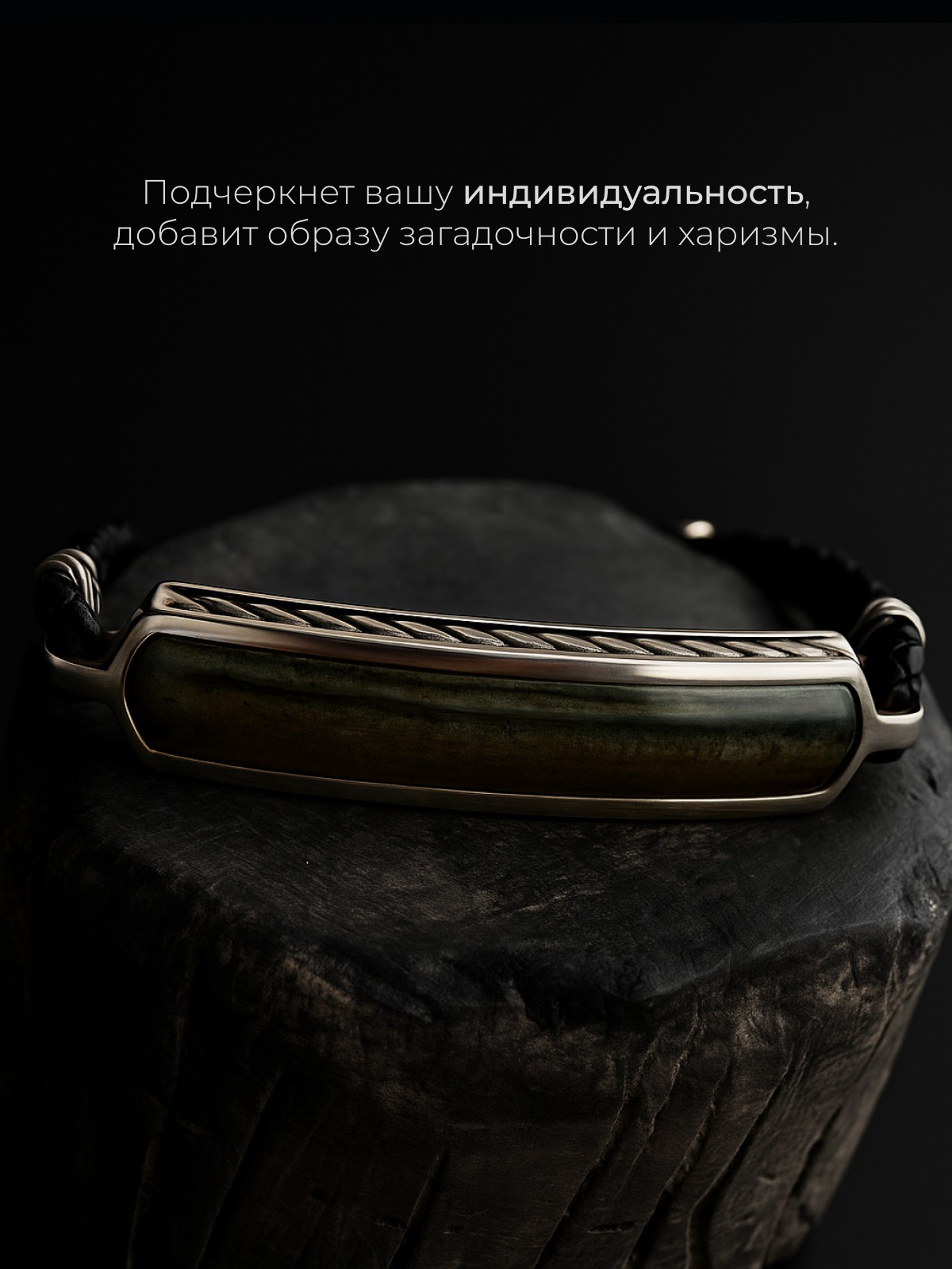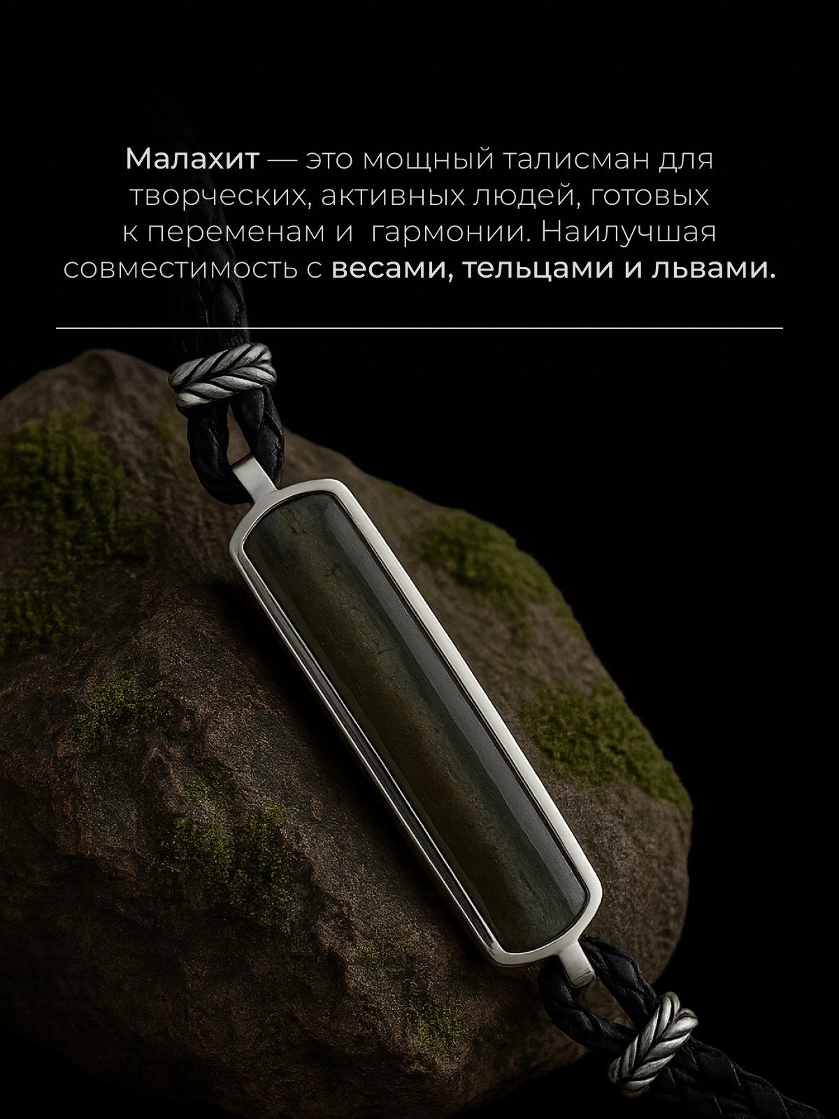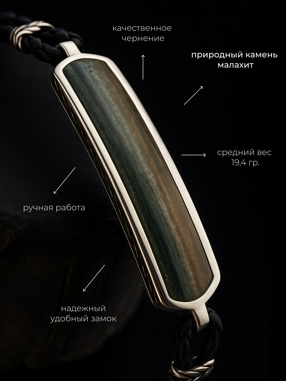 Браслет 1743М выполнен из серебра 925 пробы и украшен натуральными вставками: 1 Приморский малахит пластина 8,5 мм на 43,5 мм, вес 3,62 карат